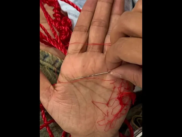 Accompanied by these garments tied together with red rope, I position myself in the center of the chosen site, placing myself fully in the public eye. In silence, and sometimes with a fixed gaze into the distance, I begin sewing parts of the fabric into the palms of my hands. This act carries a conceptual weight of connection, shared pain, care, and resistance.